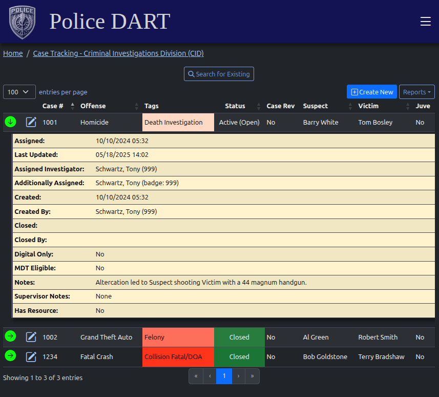 - Criminal Investigations Division (CID) Cases managed in separate module from Patrol related Cases.