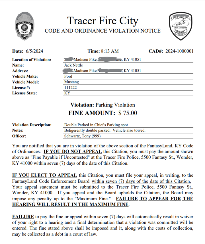 - Supports multiple jurisdictions (example is where one agency patrols or serves multiple cities). Each jurisdiction can have its own list of offenses and fines, contact information, etc.
