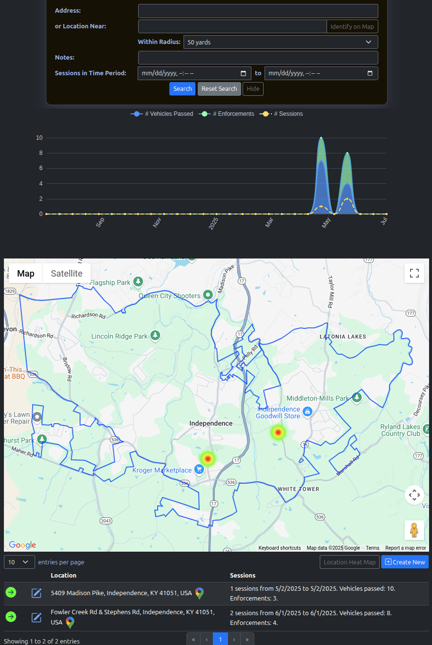 - Track Traffic Detail complaints and session activity (Vehicles passed, enforcements, warnings).